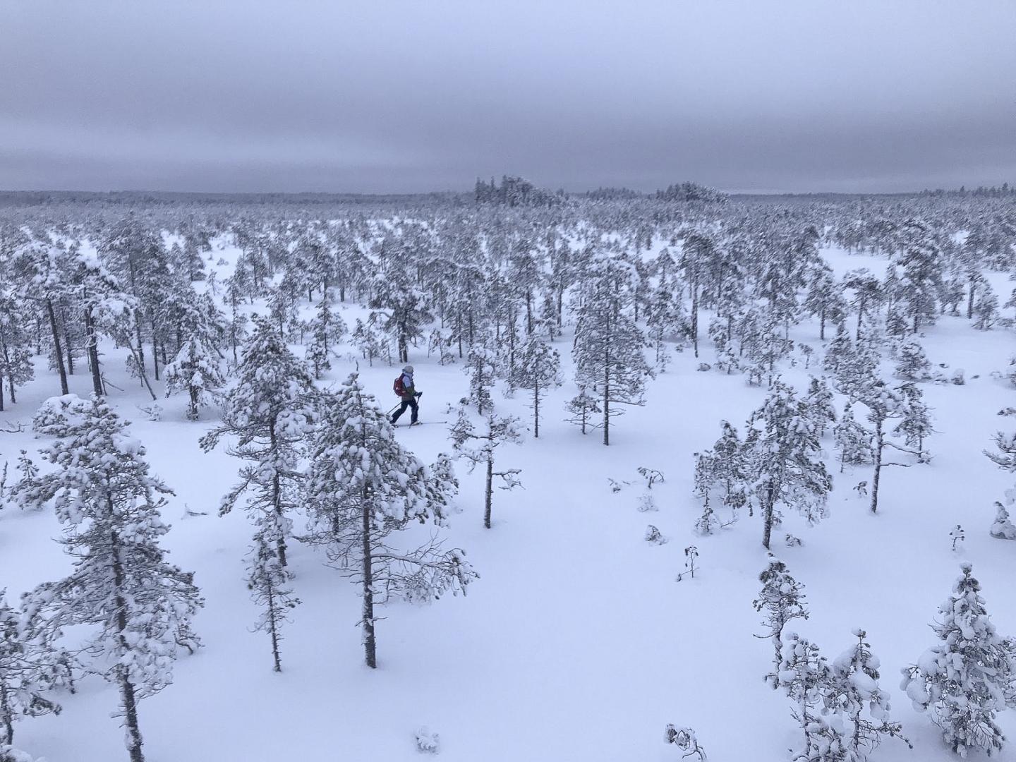 Liukulumikenkäilyä kansallispuiston metsissä, soilla ja kallioilla